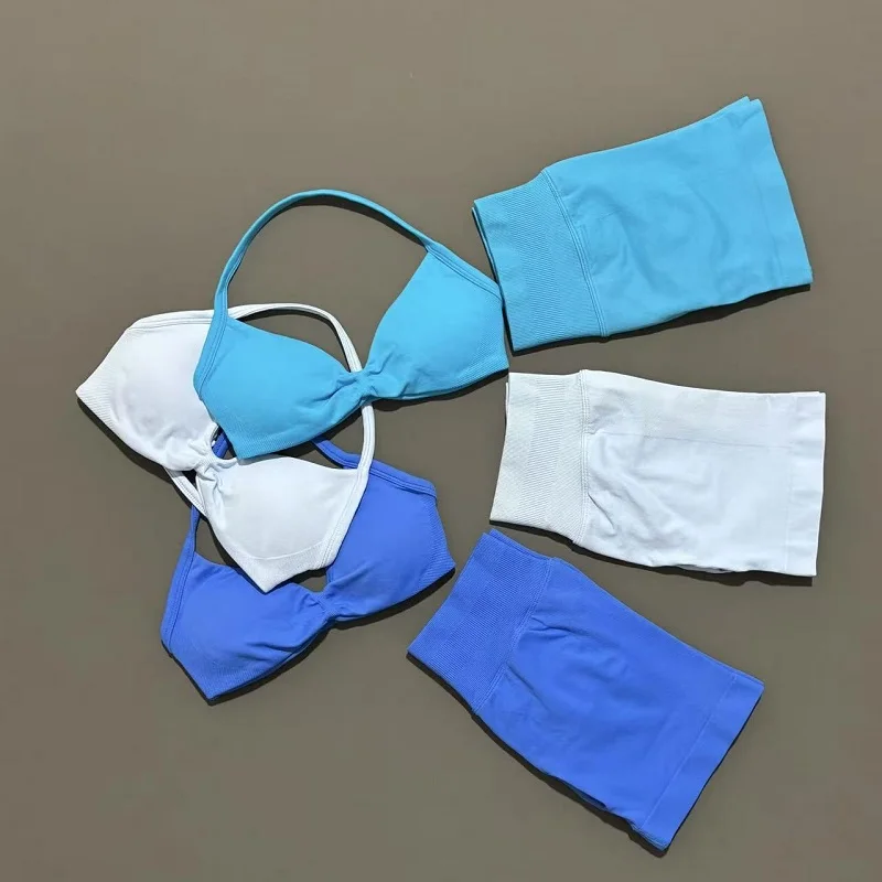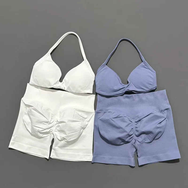 Upgrade your workout wardrobe with this stylish and functional women’s seamless gym set. Featuring a strappy yoga bra and high-waisted scrunch shorts, this two-piece outfit is designed for comfort, support, and a flattering fit.